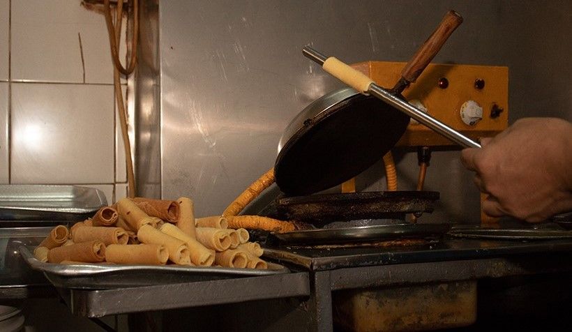 To make the sweet flaky biscuits Mr Man mixes butter, flour, eggs and sugar and adds a hint of vanilla. The mixture is spread onto an old-fashioned iron steel press, baked until golden crisp and then rolled around an iron stick. The secret is to make sure the press has the right temperature so the dough spreads easily but doesn’t burn. "We are famous for our eggrolls. We even created a special tin container, so they can stay fresh." says Mr Man.