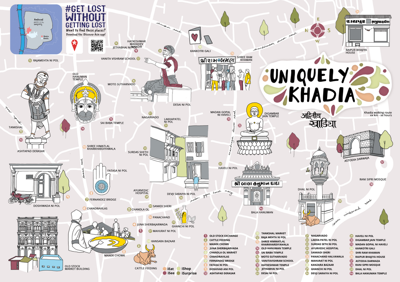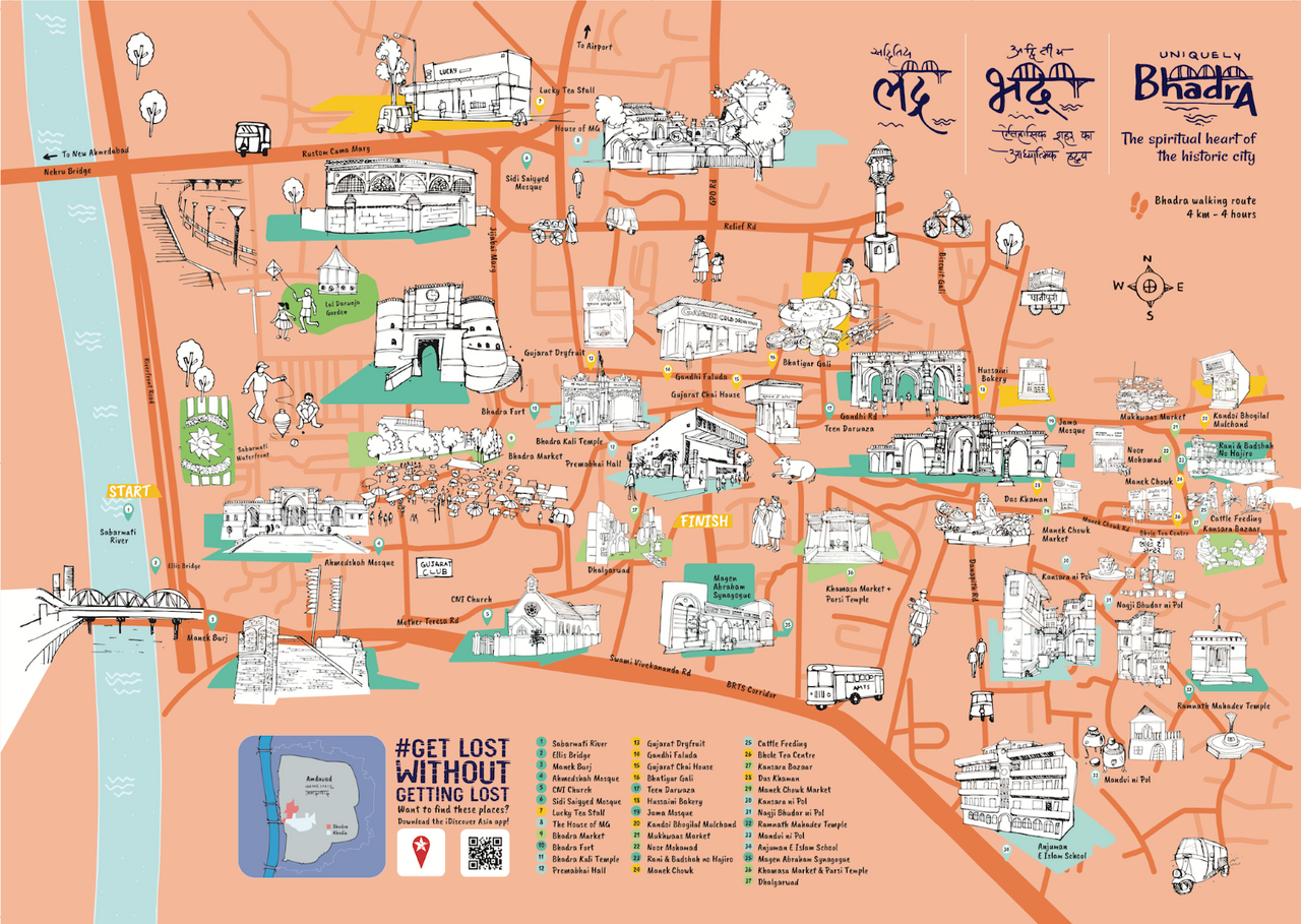 Download our beautifully Ahmedabad neighbourhood maps for free. Illustrated by the talented Maitri Dalicha, this map includes a locally-curated walking itinerary that shows you the nooks and crannies of Khadia, Ahmedabad’s most authentic neighbourhood! Explore more? We also have an illustrated map for Ahmedabad’s oldest hood, Bhadra. Both are accessible as a self-guided digital walk or as a printed map.