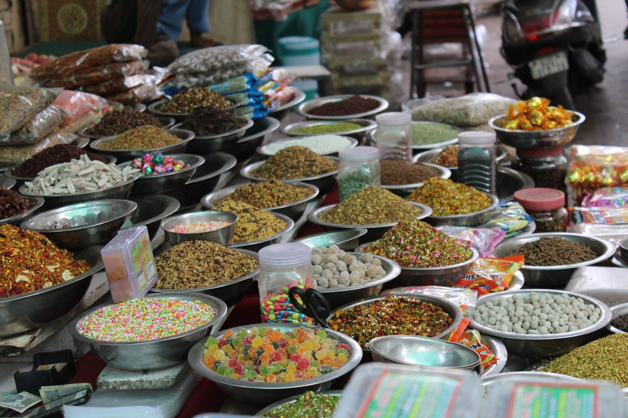 A few metres away from Mohammad’s fragrant stall, a quaint, colonial brick-arched building houses the large Manek Chowk fruit market. This building is within walking distance from the vibrant Manek Chowk, the public square all roads seem to lead to! It is the beating heart of Ahmedabad, where jewellers, cow grazers, and fast-food stalls all occupy space at various times of the day, adding vibrancy and a splash of colour to the city. Located right next to the mighty Jama Mosque, the Manek Chowk fruit market was the first market to be established within the walled city of Ahmedabad. Walk around and marvel at the colourful sights of fresh fruit, artfully stacked in bundles, and sometimes even decorated to look more appealing.