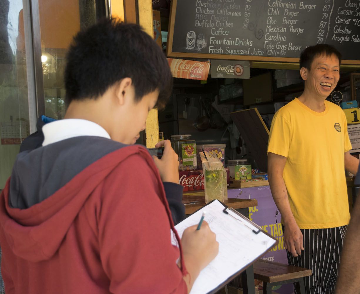 Time to dive deeper. Students were tasked with finding stories on each of the 25 places. In small teams they searched online, looked through books, and went out to visit the selected restaurants, shops and other points of interest. Each team member contributed with their skill of choice: research, interviewing, photography and film to tell the stories of place. Reflecting on output was a big part of this step, with the mentors helping them to constantly refine their process and approach to interviewing and go back to gather better information. For many students, the first time to actually have a conversation with people in the community they see on a daily basis, like the proprietors of their favourite noodle shop and the old ladies at the town square.