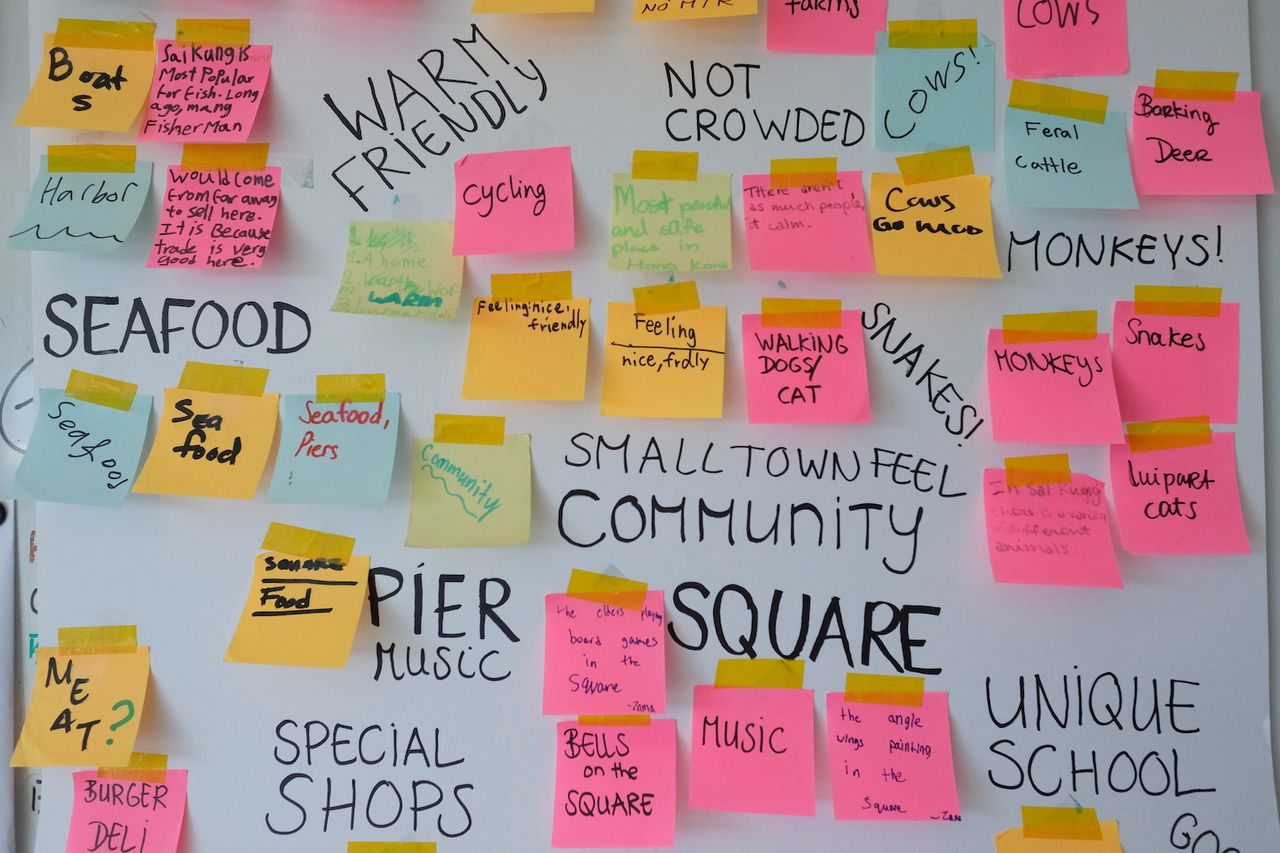 The project started with a fun scavenger hunt around Sai Kung old town to rediscover the neighbourhood, get everybody on the same page and create some excitement. In teams of four, the students raced through the town, solving clues and trying local food and drinks to earn points. Back in the classroom, they talked about what makes Sai Kung old town unique. They jointly defined the DNA of the place and arrived at a joint neighbourhood narrative. Originally a fishing village, Sai Kung is home to many seafood restaurants, speciality shops and a unique laid-back atmosphere that makes it very different from other Hong Kong suburbs. The old town is also surrounded by nature parks with abundant wildlife and even cows freely roaming the streets.