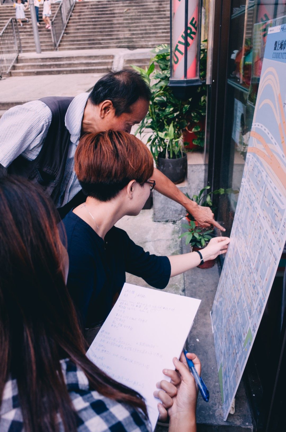 Oct 2017 - Curative Workshops. We got a group of local residents and students together, some new to the hood and some who had lived there for over 50 years. We talked about identity, landmarks and what it means to be a “Sai Ying Punner…”. We hit the streets carrying around a big print of a SYP map. With the help of 20 students from Chinese University, we knocked on doors of every local shop to have a chat. Everywhere we asked the most important question: “What makes SYP so special and what are your favourite places?“. We walked away with a list of over 60 shops, restaurants and other unique spots, from Old Tsan Yuk Hospital to Lee Zam Kee, a popular local clothes repair shop.
