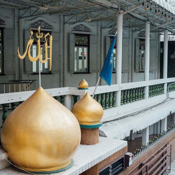 The mosque’s front gate and second floor balcony belies the building’s beauty. Look past it and see the original design’s old charm with shuttered windows, carved pediments and floral motifs that were popular at the time of its construction.