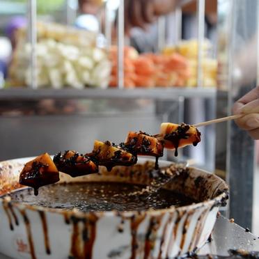 Try this popular snack. Rojak is a traditional fruit and vegetable salad dish, served with a hot and spicy dressing made from ground chili pepper, palm sugar, shrimp paste and peanuts. Pick the fruits you like, dip them into the sauce bowls and enjoy! It’s about RM 0.6 per stick. The stall is right in front of Klinik Kesihatan, opens daily from 12-7pm except Fridays.