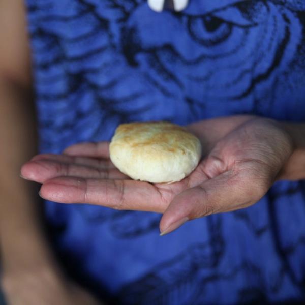 Ten workers form a production line are the diameter of the shop. One worker rolls the dough, another inserts a ball of peanut butter in the centre and the last one brushes the dough with egg yolk.