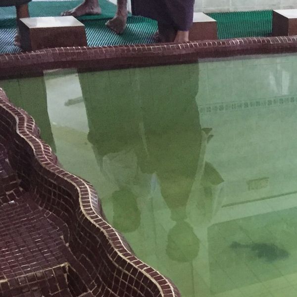 Within the mosque there is a small basin where men wash their feet and hands before prayer. It is also the swimming pool for some large carps. It is said that two or three days before an earthquake occurs in any part of the country, the fish jump out of the water.
