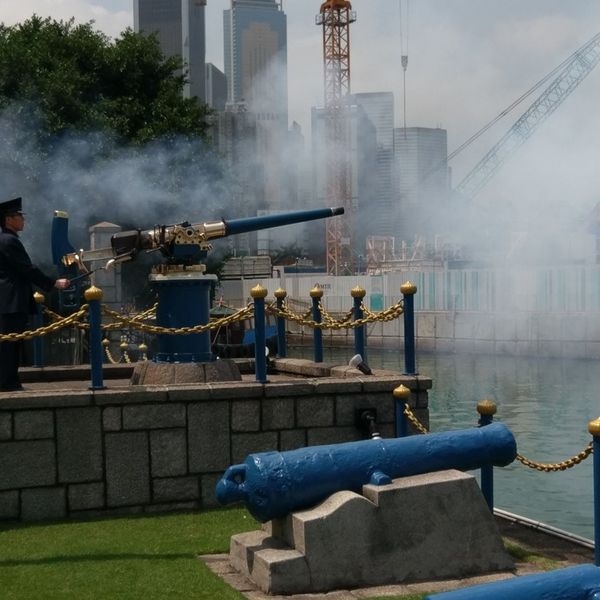Jardines has taken its commitment seriously, so the gun continues to be fired every day at noon. Land reclamation has pushed the shoreline further and further into the harbor, so the gun is now located next to the Causeway Bay typhoon shelter.