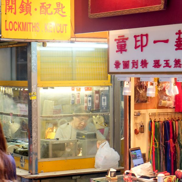 Just off Theatre Lane is another small alleyway where traditional tradespeople offer services like shoe repairs, namecard printing and key cutting.