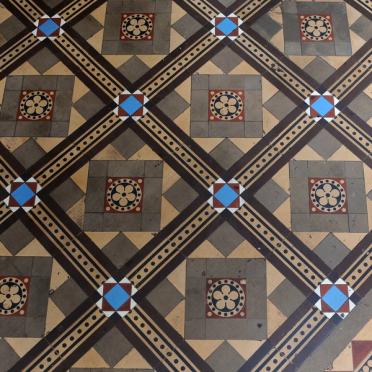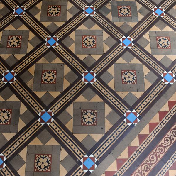 The floor tiles with a mosaic pattern of green, gold, burnt sienna and lapis lazuli that you see throughout the building were shipped from Manchester.