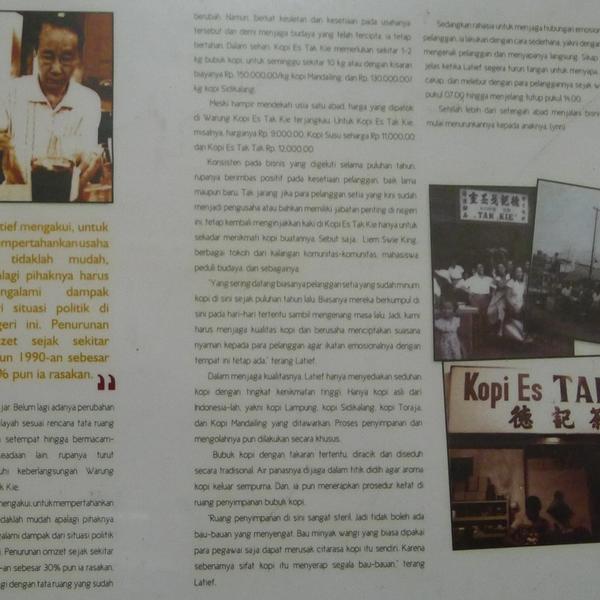 Tak Kie means 'learn good things from anyone in life', a philosophy that the shop's owner, Mr Liong Tjoen, fully embraces. Since his grandfather started this coffee shop in 1927, Tak Kie has been known for its quality coffee and the genuine kindness of the owners. Don't expect to see doppio macchiatos or caramel lattes on the menu; coffee at Tak Kie is the real deal. Made of the finest coffee beans in Indonesia, at Tak Kie coffee comes in only one flavour: strong!