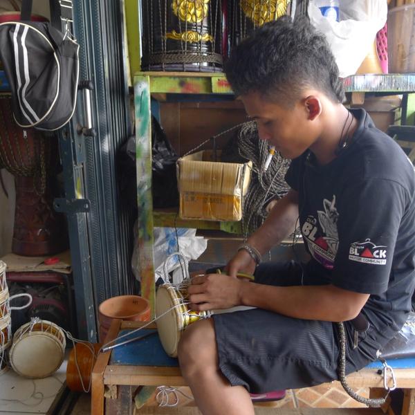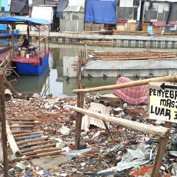 The bridge between the two kampungs was destroyed in 2016 as part of the redevelopment plan. Mr. Achmad - owner of local laundry shop - built a ferry out of the rubble to reconnect the two villlages. Pak Suarto who used to sell seashell crafts at Pasar Ikan says: “I had to pack up my life when the shops were destroyed, now I’ve opened a new shop here”.
