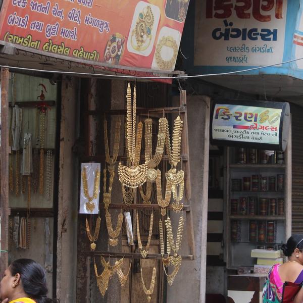 Tankshal market offers a great variety of goods: “From the Doshiwada ni Pol gate you first pass feeta mandir, clothes, stationery and vegetables stalls, then Jain religious items, followed by a line of imitation jewellery shops and gas stoves. Finally near Kalupur station are grain and flower shops” says Nitinbhai, owner of Rajkamal Novelty shop.