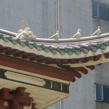 Look up to the roof; you’ll see a dragon head next to some peaceful doves, representing East and West.