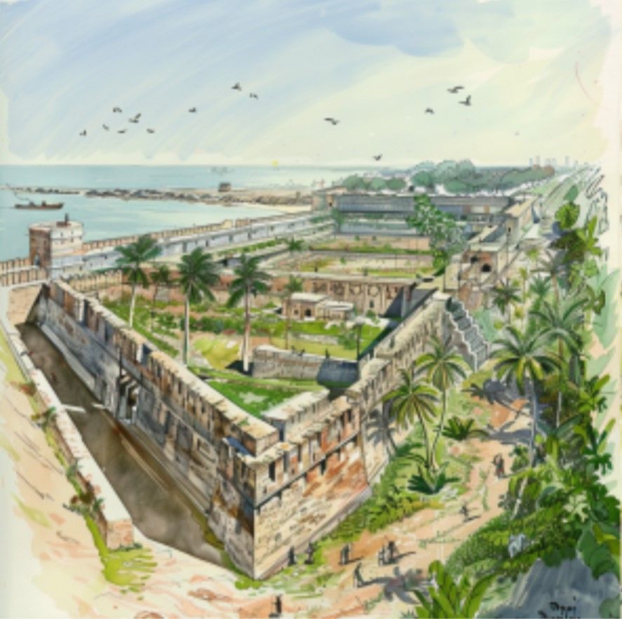 With the lagoon on one side and the townscape on the other, the fort carries huge potential for recreational use, like the bastions of the Galle and Matara Forts. We also would like to see a (digital) resurrection of the different historical layers of this special place. AI provides a sneak preview of what Jaffna Fort could look like as a green public heritage park to be enjoyed by locals and visitors alike.
