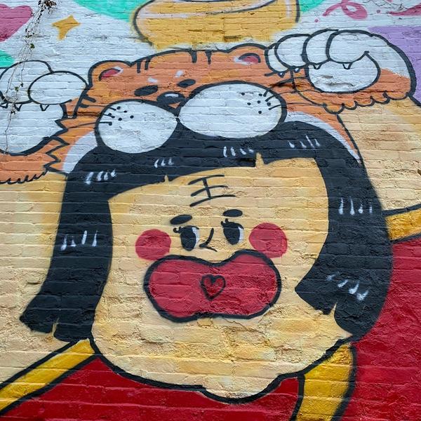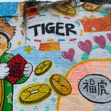 Cartoonish children and tigers painted in bright colours create an auspicious and joyful atmosphere in the neighbourhood.