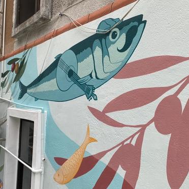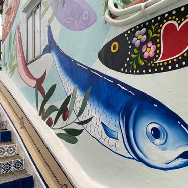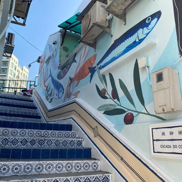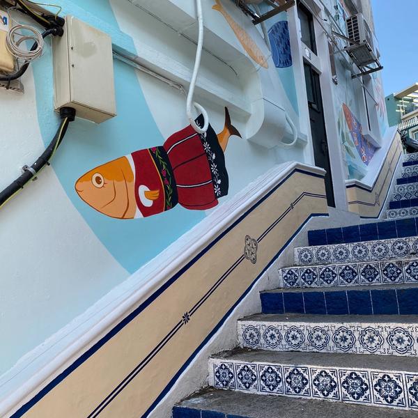 In collaboration with the Taipa Village Association, the Cultural Affairs Bureau invited Local artists Vong Tze Lai (Vitorino) and Jane to create murals on the Escada do Coxo in Taipa. Their creation shows colourful sardines and whitewashed cascades with the characteristic design of Portuguese bricks.