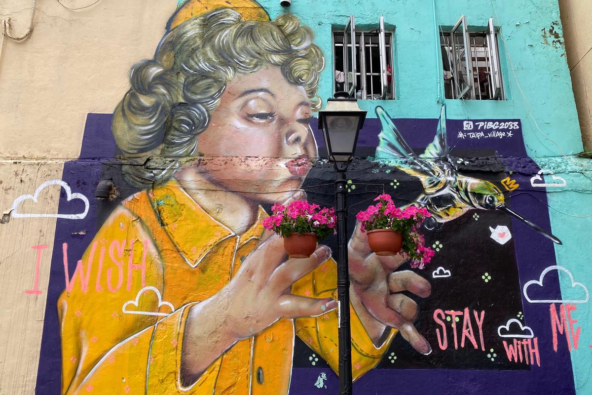 This mural was created to boost hope and positivity to Taipa Village in the fight against the pandemic. The naïve child and agile hummingbird symbolize joy, peace, healing and happiness. Tiny they might be, but they both embrace the potential to bring positivity and power.