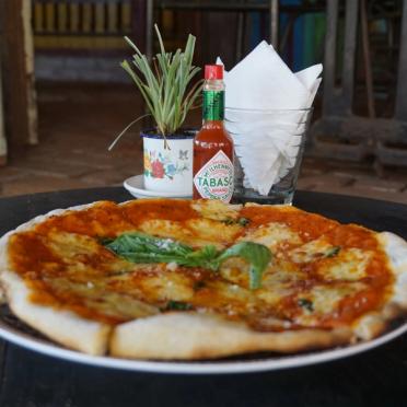 It is a wonderful place to camp out on the comfy patio with a book, and watch the day go by. The lunch and dinner menu have an Italian flair featuring pizza and pasta, but truly, most people come for the coffee and banana chocolate cake (IDR 45.000).