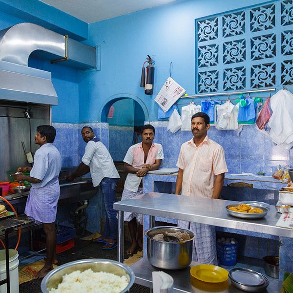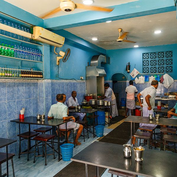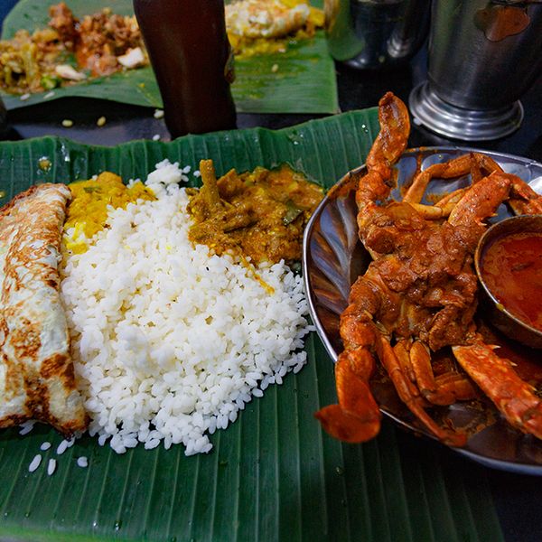 Rice and curry is what you get here, they serve it on banana leaves and you get to pick your sides. We like our curry with a steaming omelette and of course a crab. Prices range from Rs. 120 to 400. You can also just get crab without the rice for Rs. 300. The place is hugely popular and gets packed at lunchtime, so be quick or be smart and order take-away.