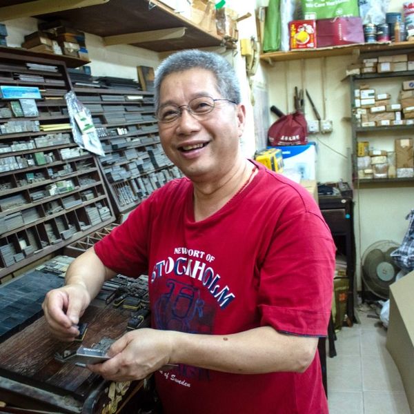 Kam Hing is an old-school print shop. They still use an original letterpress machine, which is unique; few of these machines are left. When you enter the shop, you see the vast collection of lead type face lettering neatly stored in wooden boxes. English letters in alphabetical order, the Chinese characters in cube shelving with the type stacked into a square or column, facing outward, for easy identification.