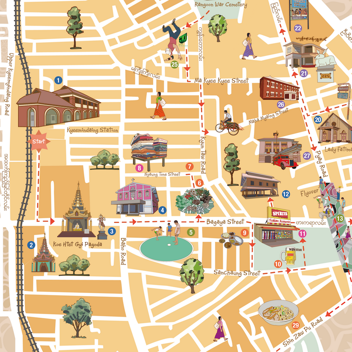 This map was created by 20 youngsters from the Sanchaung neighbourhood, as part of a mapping project by Doh Eain, a social enterprise that helps residents to restore buildings and design public spaces to make their city more vibrant, inclusive and sustainable.