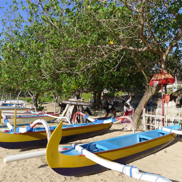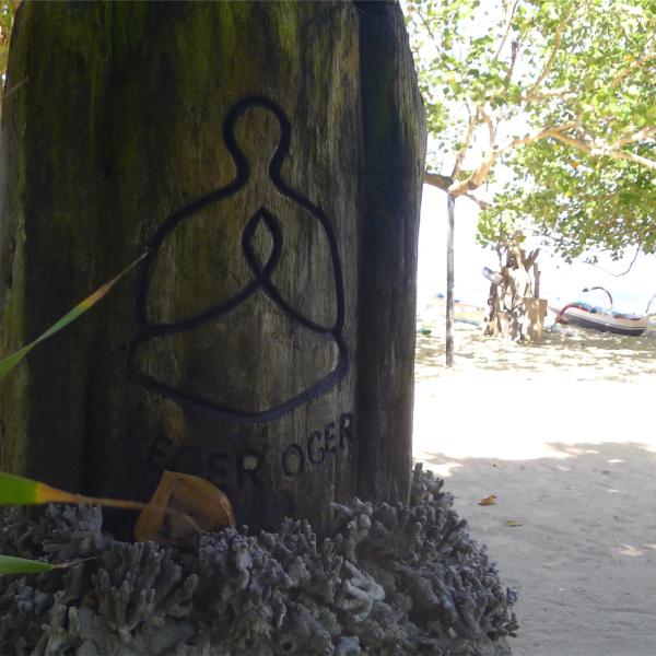 Seger Oger started under the trees at Grand Bali Beach hotel. They still practice there on Sundays, but the daily session is now at Pantai Karang under the trees with coconut faces.