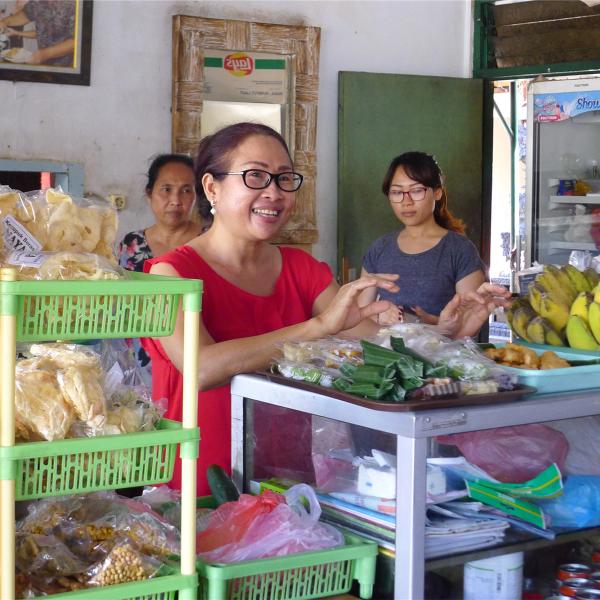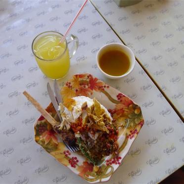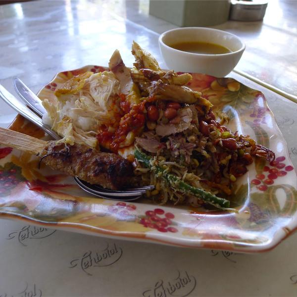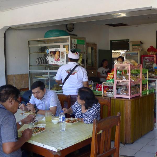 People travel from far to Warung Adi for their signature - and only - dish: nasi campur ayam: chicken and rice Bali style. It is much more exciting than it sounds as it comes with lots of yummy extras: chunks of tuna, urab sayur, (steamed bean salad) ayam betutu (stuffed chicken) pindang (pickled fish), a fried prawn, crispy chicken skin, a boiled egg with sambal and peanuts sprinkled on top.