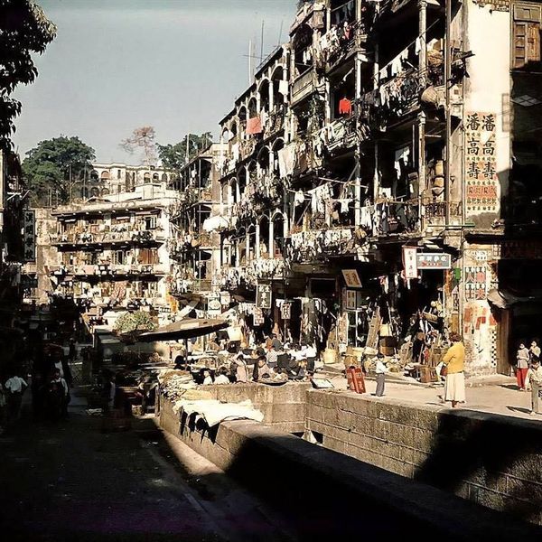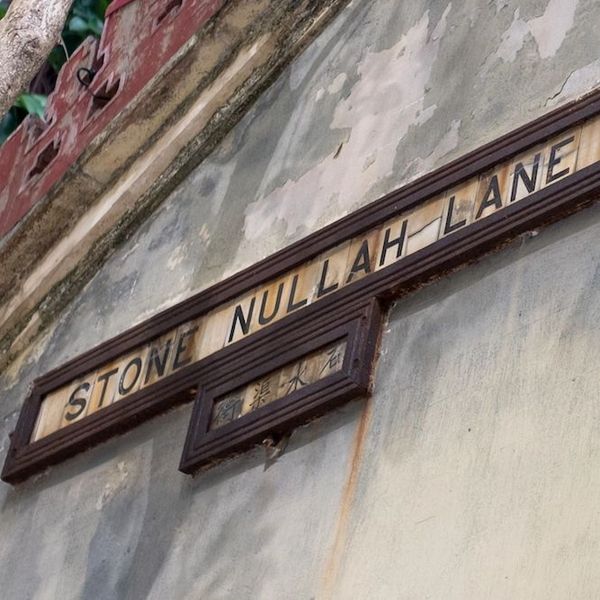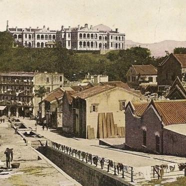 Difficult to image now, but until 1959 there was a small river that ran down the middle of this street from the Kennedy Road mountain into the Victoria harbour (where Queen's Road East is now). A stone wall was built to prevent flooding in the rainy season: a Stone Nullah.